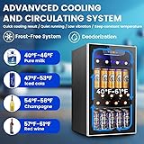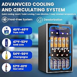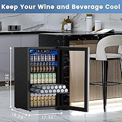 Fresh, Cool Beverages Any Time: Whether you are preparing for a party or you want to enjoy fresh drinks anytime, the 3.2cu.ft beverage refrigerator is what you need! Upgrade your man cave or serve your guests with cool drinks at perfect temperature with our wine cooler refrigerator! Under Counter Beverage Refrigerator: Features a 3.2cu. ft volume that can hold to 130 standard cans! The 4 adjustable wire racks offer efficient service and can accommodate wine bottles, cans of beer, bottled water. Equipped with LED lighting, you can easily spot your preferred drink in the dark! Smart Temperature Control: This beverage refrigerator is designed for ultimate performance! The precise temperature control button allows you to select the optimal temperature from 32℉ to 61 ℉ as per the requirements of your beverages and your taste. Ensure that you are promptly served chilled beverages. Excellent Cooling: Our beverage refrigerator with glass door is equipped with a high-performance compressor that provides constant and even cooling. The glass door ensures airtight sealing to keep cold air inside and maintain your drinks at the ideal temperature at all times. Quiet Beverage Cooler: Fit seamlessly under countertops, providing easy access to beverages and snacks without taking up much space. You can also use as a freestanding beverage center in your man cave, basement, game room, home bar garage, or any other space where you like to relax and enjoy a cold drink.