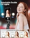 【Lightweight Aluminum Design】 Constructed of high-quality aluminum alloy, this phone tripod telescopic pole is both lightweight and durable, ensuring stability and reliability in a variety of environments. The sturdy metal support rods enhance overall stability for safer use 【Universal Compatibility】 This tripod for iPhone comes with an integrated 1/4-inch thread, camera, GoPro and ring light compatibility, and the cell phone fixture works with Phones and Android devices with screen sizes from 4 to 7 inches is a versatile solution for all your photography needs 【Rechargeable Remote Control】 The detachable rechargeable remote control allows you to take photos and start recordings from up to 10 meters away, and the Type-C charging cable allows you to easily power up your camera on the go without the hassle of changing batteries 【Dual Chargeable Led Fill Light】This selfie stick with light features three adjustable modes - white, soft and warm - to provide ideal lighting for makeup tutorials, cooking videos and live streaming. Adjust the intensity to enhance visual effects and minimize shadows 【Enhanced Adjustability】 Featuring a 360° swivel head, 270° tilt, and 360° balancing handle, this cell phone stand adjusts from 11.6 inches to 71 inches in height to allow you to capture unique angles and panoramic views with ease. Package includes 1x selfie stick, 2x LED fill light, 1x Bluetooth remote control, 1x carrying case and 1x user manual