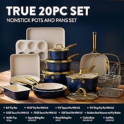 ELEGANT YET PRACTICAL: The Gotham Steel hammered collection is beautiful and makes a statement in every kitchen, yet nonstick, lightweight, scratch resistant and dishwasher safe! COMPLETE KITCHEN IN A BOX: Includes everything you need to completely outfit your kitchen and take cooking and baking to the next level, includes a full cookware set with frying pans, skillets, saucepans, stock pots with tempered glass lids, a deep frying and casserole pan with a steamer tray, fry basket and lid plus a complete PRO baking set with cookie sheet/jelly roll pan, loaf pan, muffin tin, square pan and more! ULTIMATE CERAMIC NONSTICK: The Gotham Steel nonstick cooking surface is coated three times and then reinforced with diamonds to deliver the ultimate food release. No seasoning or even oil or butter needed, makes for healthier eating, and provides for hassle free, 1-2-3 cleanup. EFFORTLESS CLEANUPS, DISHWASHER SAFE: Spend less time with cleanup! After all the cooking and prepping is done, place cookware in the dishwasher for quick and easy cleanup. STOVETOP/OVEN SAFE: Compatible with gas, electric, glass cooktops & oven safe up to a sizzling up to 500° Fahrenheit, lids included! METAL UTENSIL SAFE: The coating of the pan is infused with diamonds, the strongest material on earth which makes it durable enough to withstand metal utensils, spatulas, spoons, whisks and even electric beaters while delivering years of outstanding, nonstick use HEALTHY & NON-TOXIC: The Gotham Steel coating is composed of ceramic and reinforced with titanium, ensuring this frying pan is free of PFOA, PFOS, lead & cadmium for an eco-friendly, healthy experience for your entire family.