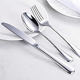 60-Pcs Silverware Set contains: 20 Dinner Knives, 20 Dinner Forks, 20 Dinner Spoons. Service for 20 people. It will be the great choice for family dinners, restaurants, picnics, BBQ, wedding, and so on. Premium Stainless Steel: This silverware are made of premium stainless steel. These dinner forks are solid, corrosion-resistant, rust-resistant, no smell, which ensure you enjoy every bite of food safely and provide you with a sturdy silverware set that will last many years. Smooth Edge: Unlike some brands that have sharp edges that can hurt your mouth, this flatware set is designed with your safety in mind. Each fork and spoon is finely polished by hand 10 times to ensure a smooth edge that won't hurt your mouth when you use it. Classic Style Design: This cutlery set adopts a classic style design, simple yet noble. It has the right weight and length that makes it be the most handy one to hold, and you don't need to worry about being too heavy or too light. Easy to Clean: Dishwasher safe, but we recommend hand washing for longer life. After cleaning, allow to dry thoroughly before storing. Refrain from using wire brushes, abrasive sponges or harsh cleaning materials as they may damage the flatware.