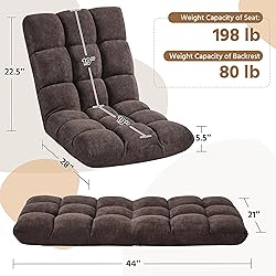 Comfortable Floor Chair: Our folding floor chair is built for relaxation and comfort. The seat measures 21 inches (width) × 19 inches (depth) and is padded with 3.5-inch thick foam, bringing you a larger sitting area and a snug reclining experience Multifunctional: Featuring silhouettes in a neutral hue, our floor sofa chair set can be used on the floor, bed, ground and more. Whether reading a book, playing games, watching TV, meditating or playing with pets, this padded floor chair can provide optimal back support and utmost comfort in a cozy position you like Sturdy and Durable: The padded lounge chair is crafted with premium metal, soft fleece fabric and high-density foam for a solid structure and long serving time. With a load capacity of 198 lbs per chair, this single floor chair is more comfortable for medium-sized users Luxurious Touch: The mix of soft fabric finish and big biscuit tufting brings you a luxurious and inviting look. With the stain-resistance surface, clean with a damp cloth and mild soap once spoiled Fourteen Tilt Positions: This set of two floor game chairs is thoughtfully designed with 14 tilt positions for various needs. It is super easy and labor-saving to adjust the position from 90 to 180 degrees. Place the chair flat on the floor, then lift up the backrest and stop at a suitable position