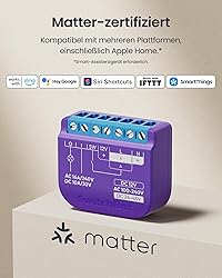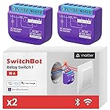 Smart relay switch with Bluetooth repeater, Matter compatible: easily control devices directly with Alexa, Apple Home, Google Home or SmartThings (requires a compatible speaker). The integrated Bluetooth repeater supports networking of up to 10 SwitchBot Bluetooth subdevices and ensures seamless connectivity. Supports 2 Bluetooth devices with Matter and can be controlled via Apple Home. Note: Please add the device to SwitchBot app first, then switch to Matter add mode in device settings. 【Makes old devices smart instantly】Compact device (4.2 x 3.7 x 1.6 cm), fits most switch boxes and sockets without rewiring. Fast 10 minute installation for remote control and automation of light, fans, heating and air conditioning. Versatile control options: connection via WLAN without hub for remote control via smartphone. In case of internet failure, local control via Bluetooth. Matter protocol allows direct connection to Alexa, Apple Home, Google Home, and SmartThings for voice-controlled, hands-free operation. Adjustable smart scenes: automatically turns on the lighting when door opening or movement (SwitchBot sensor required) and turns off the hallway lighting at a preset time. In combination with SwitchBot meter, garden watering can be automated based on temperature and humidity. Safe and reliable: The V0 flame retardant housing with overtemperature protection disconnects the power supply in emergencies. After failure, the switch will restore the previous state. Equipped with an ESP32 processor for improved communication, data transfer and efficient control.
