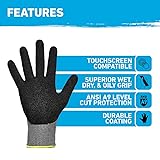 Nylon;Nitrile Imported Work gloves offer the following ANSI cut resistance: EN388 rating 4 x 43 F: abrasion 4, tear 4, puncture 3, cut F Textured nitrile coating offers superior grip in wet, dry, and oily conditions Touchscreen sensitive thumb and index fingers Knit cuff keeps out dirt and debris Machine washable for a longer life