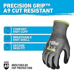 - GORILLA GRIP Precision Grip Cut-Resistant work gloves provide serious industrial grade, cut protection, resisting cuts and punctures while maintaining a superior grip in wet or dry conditions. The extremely durable coating protects your palm and fingers while the comfortable knit shell and cuff keeps out dirt and debris. Ideal for confidently handling everything from large tools to small parts or working with sharp blades, rough metal or glass, these are the perfect work gloves to keep in your toolbox, tacklebox, in your shop or in your car.