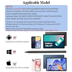 【Wide Compatibility】-This stylus pen for touchscreen is for capacitive screen electronic product and is specially designed for Android device on the market.The iphone stylus pen is suit with Samsung/XiaoMi/Huawei/Vivo/Lenovo/Pixel/iPhone 6-15 ,Amazon Fire Series tablet and other android device. Some compatible Samsung device models-Samsung Galaxy Tab A9/A9+/S9/S23 FE/S24/S25/Z Fold5/Z Fold 6/A13 /A25/ (Note: This lenovo pen is not compatible with Microsoft devices,Apple iPad,Kindle devices,Windows,Laptop,Fire 10,Samsung Galaxy Fold 7,Samsung S7+,samsung tab s4,S10,A10 and One note app. Please check your device model before placing an order.Please note that our stylus is not suit with iPad. 【Smart Touch Switch & Power Save】-The touch screen pen stylus is easy to use: just double-tap the top of the android tablet stylus pen . There's no need for drivers or bluetooth settings. This iphone pen uses the USB-C charging port,just 35 minutes of charging will give you 8-10 hours of operation.Our digital pen has smart energy-saving feature, automatically turn to "sleep mode" after 5 minutes of inactivity and avoid unnecessary battery consumption. 【High Precise and Sensitive】-The pom tip of the stylist pen is wear-resistant,designed for professionals who need high precision and accuracy,is a great feature for anyone who uses a stylus pen android for designing work or drawing. They are very smooth and high responseon the screen, without lag or jumping.Luntak android stylus pen also a great gift for family and friends who love to create. 【Magnetic Absorption】-The magnetic feature is a great convenience for users who want to keep their samsung pen close at hand and prevent it from getting lost,more portable and more easier to organize.(Note:Magnetic adsorption is ONLY for iPad mini 6,iPad air 4th&5th,Pro 11" (1st&2nd&3rd&4th),iPad Pro 12.9" (3rd&4th&5th&6th). The magnetic spots on other tablets may not match perfectly.) 【What You Get】-Our tablet pens for touch screen set includes:1* stylist pens,3* Replaceable POM Tips,1* Type-C charging cable,1* User Manual.We support 1-year product warranty and 1-month free return and exchange policy for our pen with stylus tip. If you encounter any issues, please don't hesitate to contact us. Please note the apple pens does not support palm rejection, so avoid touching the screen with your hands.Does not support pressure sensitivity.