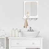 - This compact 16x12 inch wall-mounted mirror is a practical and stylish addition to any home. The built-in 4-inch-wide shelf offers convenient storage for daily essentials, like keys, makeup, or decorative items, while the three sturdy hooks below provide space for hanging scarves, bags, or other accessories. Its clean, white design complements a range of decor styles and is ideal for small spaces such as entryways, bathrooms, or bedrooms. This mirror combines functionality and style, helping you stay organized while enhancing the visual appeal of your space. With easy-to-mount hardware, installation is quick and hassle-free.
