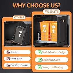 【Check Cabinet Size Before Purchase】This pull out trash can under cabinet kit measures 14.5"W x 21.6"D x 10.6"H and fits double kitchen trash can bins (each ≤ 9 gallons). Minimum cabinet size required: 16"W x 23"D x 12"H. Please measure carefully before purchase and check for hinges, pipes, or shelves. Designed for both small and large kitchens, this kitchen trash can under sink system helps maximize space. 【Heavy-Duty & Silent Glide】 Built with a reinforced steel frame, this cabinet trash can pull out kit supports up to 130 lbs with reliable strength. Premium ball-bearing slides ensure the pull out trash cabinet operates smoothly and quietly, reducing noise and wear for everyday use. This under cabinet trash can pull out organizer offers long-lasting stability for your home. 【Flexible Twin-Mode Installation】 Choose between base-mounted pull-out with handle or door-mounted style for a seamless look. This versatile design works as an under sink trash can pull out system or as a hidden trash can cabinet in kitchens, bathrooms, laundry rooms, or RVs. The fully concealed setup saves floor space, keeps odors contained, and prevents pets like cats or dogs from tipping over the trash. 【Double Bins for Trash & Recycling】 The RUNMI system is designed to hold two 28–35QT (7–9 Gal) bins, making it a true double garbage can for kitchen use. Whether for separating recyclables from daily trash or organizing waste more efficiently, this double pull out trash can under cabinet provides a clean and eco-friendly solution. Perfect for families who want a double trash can cabinet to keep their kitchen organized. 【Easy Installation & Wide Application】 With step-by-step instructions and a detailed video tutorial, this under sink trash can pull out kit is easy for DIY beginners and pros alike. Ideal for kitchens, pantries, garages, and RVs, the pull out trash can organizer makes waste sorting simple. Our 24/7 customer support ensures you get the most from your double garbage cans for kitchen installation.