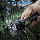 HIGH LUMENS & BRIGHTNESS:Super Bright Flashlight is made of the latest LED chip, which can output 99000 high lumens.LED flashlight is 2 times brighter than normal incandescent bulbs, and lasts more than 120,000 hours. Suitable for home, camping, hiking, night running, mountaineering, and other outdoor activities. LONG LIFE TIME & QUICK CHARGE:Rechargeable flashlight with upgraded performance and up to 12 hours of illumination time. With USB fast charging mode, 2 times faster charging than traditional micro charging port, fully charged in 3-4 hours. Four blue indicator lights show the power level (25%, 50%, 75%, 100%). 7 LIGHTING MODES: 3 main lighting modes (high/medium/strobe) + 4 COB modes (high/medium/red/strobe). Quickly press the on/off button twice to switch to COB mode, and press and hold for 2 seconds to turn off any mode directly. Use as a work light or warning light in an emergency. ADJUSTABLE LIGHTING RANGE: This LED flashlight allows you to switch the light you need by retracting the head to suit different environments. Pull the head out for a spot light and retract the head for a flood light. WATERPROOF & ALUMINUM ALLOY MATERIAL: The flashlight is waterproof and can be used normally even in heavy rain outdoors. The shell is made of high-strength aluminum alloy material with a non-slip handle, exquisite and durable. PACKING LIST:You will get 2* Power Flashlight, 2* USB charging cable, 2* lanyard and 1* user manual.