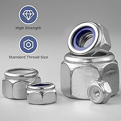 - BNUOK Lock Nuts, Nylon Insert Locknuts 304 Stainless Steel 18-8 SS A2-70 Self-Locking Nuts, Coarse Thread Hex Nylock Nuts A nylon lock nut is a kind of nut that includes a nylon insert to resist vibration and shock. This insert is located in the end section of the nut and works by deforming over the threads of the bolt when tightened, thereby preventing the nut from loosening under vibrations or torque. Locknuts with nylon inserts are widely used in many applications, limited to applications exposed to temperatures under 250°. Material: 304 stainless steel 18-8 SS A2-70 Drive: External hex Color: Silver Stainless steel lock nut can be used for many outdoor projects, like marine installation, replacing nuts on portable tent, boat trailer, build small trailers and off road lawn mowers. And other applicaions, like shower door handle repair, DIY and more. nylon lock nut, locknut, lock nut, locking nut, self-locking nut, prevailing torque nut, stiff nut, elastic stop nut, nylon insert locknut, hexagon lock nut, self-lock, hex drive, hardware nuts, nut for bolt, bolts nuts, metric nut