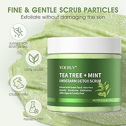 - Refresh and detox your underarms with our Tea Tree & Mint Underarm Scrub. This gentle underarm exfoliating scrub deeply cleanses, removes buildup, and helps control odor while keeping skin smooth and refreshed. Infused with Tea Tree, Peppermint, Aloe Vera, Avocado, and Walnut Granules, it gently polishes dead skin and unclogs pores without irritation. Perfect for daily underarm care or full-body use on legs, arms, knees, and feet. Safe for all skin types, free of parabens and sulfates, and ideal for both men and women seeking natural freshness and confidence all day.