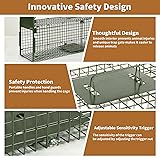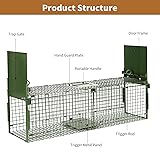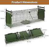 Wide Application: Measures 39.96 * 10 * 11.81 inches. Suitable for stray cats,raccoons, squirrels, skunks, moles, groundhogs, armadillos, rabbits and other small animals Animal Friendly: Trapping cages help you catch wildlife without harming them, ideal for catching and rescuing stray wildlife Specialized Design: Two doors create an unobstructed pathway to encourage animal interaction, adjustable device pedal sensitivity for easier triggering and higher capture rates Humanized Design: Easy to install and use, can be folded flat when storing, does not occupy space. Adjustable sensitivity of the pedal of the mechanism makes it easier to trigger, and the handle protection device can prevent you from contacting with animals Rugged Construction: Animal trap is made of high-quality rust-proof galvanized steel and reinforced with plastic spraying, which is durable and has a strong anti-rust and anti-corrosion ability