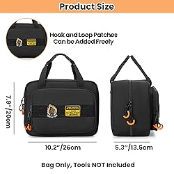 ANTI-LOST DESIGN: (Patented Design) With 1 clear PVC braided zip pocket for small electrical accessories like lead adapters and batteries. 2 elastic hook and loop fasteners fit for clamp meter. Special design prevents the tool from slipping out when opened. (Bag Only, Tester Tools NOT Included) KEEP ORGANIZED: The other side compartment with 1 mesh pocket for digital multimeter, GFCI receptacle tester. A flap board with mesh zip pocket, webbing loops and slots for NCV tester, circuit breaker finder, wire cutter, pliers or other electrical insulated tools. EXTRA STORAGE: Front pocket with 5 slots for small screwdrivers or extension cables storage, exterior magic tape loop for embroidered patches. MATERIAL: Made of friction-resistant nylon material with all padding around to better protect your electrical voltage test kit. Portable handles for easy carrying anywhere. Dual-way zipper and full-opening design for easy access. DIMENSIONS: 10.2 x 5.3 x 7.9 in. Rexmica electrician work bag compatible with Klein* tools 80101/ ET310 AC circuit breaker finder, digital multimeter, clamp meter, NCV tester, GFCI outlet and receptacle tester, etc. A great partner for electricians at work. (*Note this Rexmica storage bag is not related to the brand mentioned.)