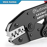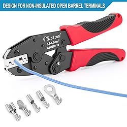PROFESSIONAL CRIMPING TOOL: This crimping tool works best with Non-Insulated Open Barrel Terminals Receptacles (AWG20-10) Plustool wire crimper has efficient ratcheting mechanism and professional grade crimping die for proper rock-solid crimps every time; Each crimper tool is marked with AWG20-18/18-14/12-10 for quick identification. Besides, crimping plier will not damage the connector PRECISION RATCHETING STRUCTURE: Wire connectors are crimped by squeezing the handle through a complete ratcheting cycle until the handle releases automatically; The tool will self open when the required amount of crimping force has been applied, ensured uniform crimps everytime; The built-in quick release lever allows to open the crimper jaws in any position ERGONOMIC HANDLE DESIGN: Plustool crimper tool is designed for ergonomic cushioned handle that provides maximum comfort and reduced hand fatigue; Non-slip design ensures strong grips in any condition and provides maximum leverage, increasing comfort and making the grip self adjusting ADJUSTABLE COMPRESSION WHEEL: Plustool crimping tool features a star wheel, which allows to adjust crimping height to ensure the right amount of crimping force depending on your crimping project; Heavy Duty Full-Cycle ratcheting terminal crimper with labor saving system helps to a easier operation WIDELY COMPATIBLE: Suitable for Non-Insulated Open Barrel Terminals Receptacles; Hand crimper can be used for home appliance repair, vehicle circuit connection, and everything about circuit connection