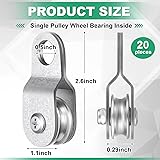 Ample Supply: you will receive 20 single pulley wheels bearing inside, which are enough for your daily use and replacement, and you can also share with your friends or family Ideal Dimensions: measuring about 2.6 x 1.1 inches with a hole diameter of 0.5 inches, our small pulley wheel is of the appropriate size for optimal efficiency; The maximum load is 70 lbs, suitable for 0.23 inch rope Sophisticated Quality: our cable pulley block is made of quality galvanized aluminum zinc; Expect exceptional strength, durability, and resistance to corrosion and rust; It will stand the test of time and challenging circumstances Open Pulley System: our small pulley wheel adopts an open pulley, and the pulley can be opened and closed to both sides, easy to thread in and out of rope; Enjoy seamless sliding and easy installation for efficient lifting and moving Wide Range of Uses and Applications: our cable pulley wheel is widely applied in wire rope pulling, object handling, such as clothesline, DIY accessory lifting pulley, machine loading, crane, ladder lift, DIY home project, shop lift, dog pulley system, and more