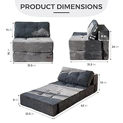 Detachable Floding Sofa Bed: This floding sofa bed adopts a zipper connection, allowing you to easily achieve the transformation from a folding sofa to two independent floor sofa cushions. It can also be used as sofa couch or unfolding bed. Whether it's a family gathering or a personal nap, the layout can be adjusted High-Density Foam: The interior is filled with high-density whole piece foam, providing superior support and long-lasting resilience of the sofa bed. And the backrest is filled high-density shredded foam. It feels soft and does not collapse, and can maintain comfort Texture & Tufted Design: The selection of corded fabric is soft and delicate to the touch, with good breathability and wear resistance. The unique nail buckle decoration not only adds the retro flavour of the sofa, but also enhances the overall visual sense of hierarchy, making the home environment more warm and elegant Versatile Usage: This floding sofa bed combines multiple functions into one, making it easy to use as a living room sofa, a game room rest sofa bed, or a friend gathering cushion. Its multifunctional features make your home life more colorful and meet different leisure and entertainment needs Please Note: The dimensions of this sofa bed are 63"x31.5"x16". This folding sofa bed is vacuum compression, please open the package in a well-ventilated place and wait for 48 hours to get the expansion experience, back to a comfortable size