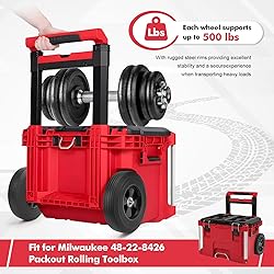 Exclusived Fit:Replacement wheel kit fit for the Milwaukee 48-22-8426 Packout Rolling Tool Box,Engineered to perfectly match the original equipment, ensuring a seamless and hassle-free installation process Solid PU Rubber Construction: Made from high-quality polyurethane, these wheels eliminate the need for tire inflation and maintenance. No more worrying about punctures or air pressure issues Robust & Wear-Resistant: Upgraded hard-grade rubber offers superior grip, increased durability, and enhanced performance, ensuring smooth operation on various surfaces Heavy-Duty Load Capacity: Each wheel supports up to 500 lbs, with rugged steel rims providing excellent stability and a secure experience when transporting heavy loads Effortless Installation: Installation is quick and simple with all necessary hardware included. Attach the wheels to the toolbox frame and securely tighten the bolts for immediate use