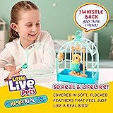 - Little Live Pets My Really Real Bird & Cage: Indie the blue budgie talk back toy is the most realistic bird toy you’ve ever seen! This robot bird features real-like feathers, a moving beak, and over 20 sounds and reactions. He tweets, chirps, whistles, and talks back! Press the top button to record your voice and the repeat talking toy will mimic it while with the bottom button, it whistles a tune back to you in perfect pitch. Pet our talking bird toys for kids on the head and back to hear cheerful chirps and tweets. This toy singing bird in cage loves to perch and swing inside his colorful bird cage, designed for both display and portability, with a top hook for easy carrying. Perfect for pretend play, these interactive animal toys for kids encourage creativity, nurturing, and imagination. The bird in cage toy playset includes 2 AAA batteries and an instruction manual for everything needed to start playing right out of the box. These talking pets for kids are suitable for children ages 5 and up. Collect both birds in the Really Real Bird series - Indie the budgie and Rosie the cockatiel, for more chirpy, talking fun.