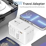 【International Compatibility】: This 70W universal adapter for travel could turn 4 different sockets into 1 universal AC outlet and 4 USB ports, charge up to 5 devices at a time; EU/USA/Australia/UK plugs, which can be used in more than 200 countries, and is suitable for charging tablets, cell phones, and power banks, giving you a better charging experience on the go. 【5 in 1 Universal Outlet 】: 1 AC output,3 TYP-C Port + 1 USB-A Port and equipped with 70W Retractable PD Fast Charge Cable can meanwhile charge more than 5 devices and all in one design can meet all your charging needs. C1 and C2 Port can reach maximum 70 wattage output. 【Easy to Use】: Simply press the slide button and you can change plugs for different countries/regions without additional accessories, allowing you to enjoy a super-fast charging experience while traveling around the world. 【Lightweight & Reliable】: Nice travel essentials for global travel! Compact and easy-to-use european travel adapter can easily fit into luggage and be taken aboard cruise. Ideal for business, students, travelers, and globetrotters. 【Widely Compatibility】: 70W travel adapter provide perfect compatibility and fast charging speeds for all USB powered devices such as iPhone 14/14 Pro/14 Pro Max/iPhone 13/13 Pro/13 Pro Max, iPhone 12/11/XR/XS, iPad Air/Pro, Samsung Galaxy, Smartphone, Tablet, Power bank, Camera, Bluetooth earphone, E-reader, Portable speakers and other device.
