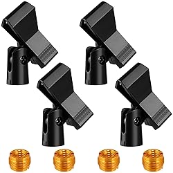- Adjustable Mic Holders with Adapters The Microphone Clip offers a robust grip, with a powerful spring that prevents your mic from dropping. The spring is designed to open wider, allowing the clip to fit a broad range of wired or wireless handheld microphones. The clip also features a standard 5/8inch female threaded insert, enabling it to connect to a compatible mic stand, gooseneck, boom, retractable tripod mic stand, or other accessory. The adjustable knob enables you to adjust the clip to your preferred angle, ensuring optimum comfort when singing, chatting, or broadcasting live. This product comes in black and gold and is made of durable plastic and copper, offering a sleek and long-lasting design. The clip size ranges from 15-50mm/ 0.59-1.97inch, and the adapter size measures 5/8"(15.5mm) male to 3/8"(9.5mm) female. The package includes 4 microphone clips and 4 screw adapters. Please note that due to manual measurement, the size may have a slight error, and there may also be a slight color difference due to differences in monitors. Ensure your microphone stays in place with the sturdy and adjustable Microphone Clip.
