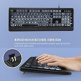 【Large Print Keyboard】- The large keys are slightly spaced, featuring big print letters to lowers the chance of hitting the wrong key. Perfect for elderly, the visually impaired, schools, special needs departments and libraries, as well as companies. 【Full Size & Ergonomics Design】- Unfold the feet at back of the keyboard to reduce hand fatigue and enjoy long hours of playing. Full QWERTY English (US) 104 key keyboard layout with numeric keypad, Large Print keys provides superior comfort without forcing you to relearn how to type. 【Plug and Play & Wide Compatibility】 - This USB keyboard takes away the hassle of power charging or swapping out batteries and is easy to setup. No drivers required.Compatible with Windows 2000/XP/7/8/10, Vista,Raspberry Pi 3/4, Mac OS(Note: Multimedia keys may not fully compatible with Mac, OS System).Works with your PC, laptop. 【Spill-proof】- This durable keyboard features a spill-resistant design. So you don't have to worry about spilling coffee and water. Enjoy Keys life of more than 5000W times.