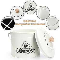 Large Capacity: The 1 gallon compost bin for kitchen counter measures 7.5 "D x 8.3"H with lid. Height without lid: 6 "H. Our compost bucket offers sufficient space to collect your kitchen food waste during the week, such as discarded fruit vegetable scraps, shell bones, leftovers, paper towels and so on. Odor Free Compost Bin: This indoor food waste bin comes with an airtight lid and a charcoal filter fitted on the lid, which can effectively capture the odors, keeping your kitchen fresh and without worrying about bad smells in your home. So you can compost until you fill the canister once a week. Premium Material and Easy to Clean: Our kitchen compost bin is made of high quality iron, coated with white paint on the surface. The composter container is waterproof and durable enough for long time use. Coming with ease, you can effortlessly wipe the compost bin with warm soapy water and dry it as soon as possible to avoid rusting. Portable Handle: Tlence indoor composting pail is equipped with a portable steel handle and a wooden lid grip, which is handy enough for you to access the composting bin and move to other places. Features with some holes on the lid ensure aeration of the food waste bucket. Elegant Decor: The white kitchen compost canister with a charcoal filter lid is designed with an elegant and stylish look, which is ideal for countertop of your kitchen, offices, homes, apartments and more. This farmhouse compost bin fits perfectly with any modern farmhouse decor and cute kitchen accessories. You don't need to hide this compost container below your sink.