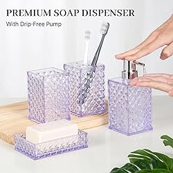 Nullify Complete Bathroom Accessory Set: Our bathroom accessories set includes a toothbrush holder, a mouthwash cup, a soap dispenser (10oz), and a soap dish to store commonly used bathroom items. Maximize your bathroom space with our compact and cleverly designed bathroom accessory set. Durable and Wear-resistant: This purple bathroom set is made of high-quality polypropylene, which is sturdy, durable and easy to clean. The pump head of the soap dispenser is made of stainless steel to prevent rust and corrosion, and the soap dispenser is very suitable for liquid hand soap, dishwashing liquid, lotion, hand sanitizer, etc. Fashionable and Simple design: Our bathroom sets accessories do not have too many complicated designs, minimalist shapes and practical functions, with soft tones, easily integrated into various home styles. While saving space for you, it can also serve as bathroom décor. Powerful Functions: Although this lavender bathroom decor sets is simple in design, it has powerful functions. The toothbrush holder has a groove buckle design, which can store multiple toothbrushes at the same time; the push-type soap dispenser can better store various liquids and maintain good hygiene conditions. The soap dish has an anti-slip function. In addition to storing soap, it can also be used to place some small items. Good Gift Idea: This purple bathroom accessories decor is packed in a beautiful package, making it a great gift for housewarming, weddings, birthdays, Mother's Day, Thanksgiving, and also suitable for mom, sister, colleagues and friends. When you can't find a suitable gift, choose it!