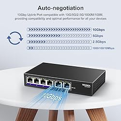 【6 Port 10G Ethernet Switch】The network switch includes 4 x 2.5Gb Ethernet ports, 2 x 10Gb RJ45 Port.Auto MDI/MDIX.1-4 Port Support 2.5G/1G/100Mbps, 5-6 Port Support 10G/5G/2.5G/1G/100Mbps. Provide compatibility and optimal performance for all your devices, including 10G NAS, WiFi7 routers, 10G adapters/NICs, servers, gaming PCs, 8K video, etc. Build a more stable and larger network. 【Super Fast Network Speeds】This network switch delivers 2.5x faster network performance than traditional Gigabit switches. With a switching capacity of up to 60Gbps, this network switch can handle large amounts of data traffic, ensuring smooth and efficient network operation. 【Plug and Play】Easy to use and simple to set up, no software or configuration required. Supports automatic MDI/MDIX and non-blocking data forwarding.Support Desktop/Wall Mount. 【Stable and Quiet】Durable metal case with 6KV lightning protection, fanless silent design for more power saving, double side cooling holes, wide temperature range -10~50°C, LED indicator lights, stable operation, easy to maintain network status. 【After-Sale-Service】 Every NICGIGA switch is rigorously tested for reliability, quality and performance. We provide a one-year warranty and lifetime technical support for the entire product.