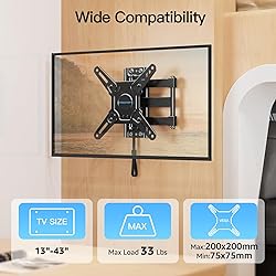 Universal RV TV Mount: The RV TV wall mount fits most 13 to 43 Inch TVs up to 33 lbs with VESA patterns 75x75mm, 100 x 100mm, 100 x 200mm, 200 x 100mm, 200x200mm, etc. Perfect for RV, camper, travel trailer, motorhome, campervan or fifth wheel. Please verify the TV size, weight, and VESA pattern before purchase. Improve Viewing Experience: Full motion RV TV mount tilts TV up 5° and down 15°, swivels left and right 90° for the most comfortable viewing angle, extends 14'' and retracts back 2.7'' for flexible movement and space-saving. Enjoy glare-free angles whether driving or relaxing in your motorhome. Lockable Design: MOUNTUP RV TV mount features a pull-cord locking mechanism secures TV position during travel. No wobbling or accidental movement – protects your TV on rough terrain. Simply pull of the cord, the highly reliable spring lock can easily be quick released to extend the TV out when parked, making it the perfect addition for your on-the-go lifestyle. Easy Installation: The RV TV wall mount comes with mounting hardware kits and detailed instructions, making it easy to finish the installation quickly. +/-3° post-install leveling to align the TV even after installation. Please note: Wooden board in the vehicle should be thicker than 1/2 inch. Efficient Customer Service: MOUNTUP professional support team is available to answer your pre-purchase and installation questions. Please let us know if you have any concerns or need assistance anytime!