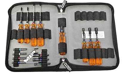 KIT INCLUDES: Hex Driver Wrenches (1) 1.3mm, (1) 1.5mm, (1) 2.0mm, (1) 2.5mm) - 1/4" Drive Bits Hex Driver Wrenches (1)1.3mm, (1) 1.5mm, (1) 2.0mm, (1) 2.5mm) - Nut Driver Wrenches (1) 5.5mm, (1) 7.0mm, (1) 8.0mm) - 1/4" Drive Bits Nut Driver Wrenches (1) 5.5mm, (1) 7.0mm, (1) 8.0mm - (1) Speed Tip 1/4" Drive Handle 100% MADE IN THE USA: Crafted with precision and pride, MIP tools are engineered and manufactured in the USA—no shortcuts, no compromises. Expect nothing less than the highest quality, built to last. COMPLETE SET FOR EVERY NEED: Includes all essential hex and nut driver wrenches, making it ideal for everything from repairs to upgrades. PRECISION & DURABILITY: Crafted with high-quality materials, MIP tools are engineered for long-lasting performance and precision. SPEED TIP TECHNOLOGY: Speed Tip Hex and Nut Driver Wrenches allow for quicker, more efficient adjustments, saving you time on the track. VERSATILE & COMPATIBLE: The Speed Tip Handle works with all MIP Speed Tip Wrenches, offering versatile functionality. ORGANIZED STORAGE: Comes with a 15-inch, 40-pocket tool bag, keeping your tools neat, organized, and easy to access for every job. DESIGNED FOR RC ENTHUSIASTS: Perfect for both beginners and experienced racers, this kit is built to meet the rigorous demands of RC maintenance and tuning.