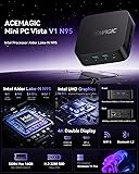 【Powerful 12th Gen Intel N95 Processor】The ACEMAGIC Vista V1 N95 Mini PC is powered by the latest 12th Gen Intel N95 processor, with speeds up to 3.4GHz Turbo Boost. Delivering 35% faster performance than previous models, it combines 15W power efficiency with exceptional performance, making it perfect for streaming, office tasks, and light photo editing. 【AMPLE STORAGE AND HIGH-SPEED MEMORY】Mini computers Comes with 16GB DDR4 RAM and 512GB M.2 SSD for seamless multitasking and fast data access. Need more space? Expandable up to 2TB(Not included) for all your storage needs. 【PRE-INSTALLED 11 PRO & EFFICIENT COOLING】ACEMAGIC mini pc pre-installed with 11 Pro for a secure, productive experience. Upgraded cooling design ensures stable performance and quiet operation under load. 【4K UHD DISPLAY & DUAL-SCREEN SUPPORT】V1 mini computer features Intel UHD Graphics supporting 4K@60Hz dual displays (HDMI + DP), delivering sharper text, vibrant colors, and a smooth viewing experience—ideal for 4K streaming and productivity. 【COMPACT DESIGN WITH VERSATILE PORTS】MINI PC small form factor (3.9 x 3.9 x 1.3 inches) with a VESA mount for flexible placement. Offers a variety of ports for seamless connectivity with multiple devices. 【RELIABLE CONNECTIVITY & PLUG-AND-PLAY】ACEMAGIC Micro computers desktop Supports Gigabit Ethernet, dual-band Wi-Fi, and Bluetooth 4.2 for fast, stable connections. Ready to use out of the box without any complicated setup. 【CUSTOMER SUPPORT & WARRANTY】The ACEMAGIC Vista V1 N95 Mini PC backed by FCC, ROHS, and CE certifications, with a 1-year limited warranty and responsive customer support via Amazon.