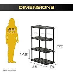 MAXIMIZE STORAGE CAPACITY :Save room in garages, closets, laundry rooms, and more. The 4-tier design helps reduce clutter and keeps items neat, while the plastic material resists rust, stains, and peeling for long-lasting use. BUILT TO LAST : Each shelf supports up to 150 lbs when weight is evenly distributed. Design is versatile for indoor and outdoor environments that won’t rust, stain, or peel. EASY TO MOVE: The durable yet lightweight build makes it easy to lift, reposition, and reconfigure your storage layout. Ideal for basements, utility rooms, sheds, workshops, and pantries. MADE IN USA: Injection-molded from recycled, reusable materials that are BPA-free and phthalate-free. Built for durability and sustainability without compromising performance. SIZED FOR REAL STORAGE NEEDS: Fully assembled dimensions: 53"H x 36"W x 18"D. Interior shelf space: 14.6"H x 31.4"W x 13"D.