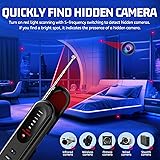 Detect Hidden Cameras Anywhere:Featuring advanced infrared technology, this camera detector spy camera finder makes it easy to spot hidden cameras in outlets, vents, smoke detectors, and more. Simply activate the infrared strobe light and scan suspicious areas to quickly identify the telltale bright reflections of a hidden camera, so you can safeguard your privacy wherever you go. Wide Signal Detection Range:Scanning frequencies from 1MHz to 6.8GHz, this hidden camera detectors for travel covers WiFi, Bluetooth, GPS trackers, and SIM card transmissions. The gps tracker detector broad frequency range ensures no surveillance or tracking device goes unnoticed, offering peace of mind in any environment. Customizable Sensitivity Settings:Equipped with a high-performance chip, the hidden camera detector provides five sensitivity levels to fine-tune detection within a 0.1 to 10-meter range. This ensures accurate identification of wireless signals while avoiding false alarms, making the rf detector easy to pinpoint hidden devices. Versatile Detection Modes: This hidden camera detectors is with three detection modes, you’re prepared for any situation. Use infrared mode to locate hidden cameras, signal mode for wireless transmissions, and select between red (2.4GHz) or blue light (1MHz–6.5GHz) to scan for WiFi, Bluetooth, or a wider range of bugs. Stay protected with this all-in-one privacy tool. Portable and Discreet Design:Compact and lightweight at just 4.33 x 1.1 inches, this hidden camera detectors for travel fits easily in your pocket or bag. It offers up to 10 hours of battery life per charge and includes visual indicators and a silent mode for discreet operation—perfect for safeguarding your privacy on the go.