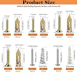 Drywall anchors kit can support objects with a maximum weight of 75 pounds, and can be used to connect gypsum wallboard, which is very suitable for hanging various items on the walls of the home, such as photo frames, wall lamps, curtains, clocks, plants, televisions and cabinets Self drilling drywall anchors are plated with galvanized steel upgraded in 2025, the surface of the golden expansion pipe is plated with yellow zinc which is not easy to oxidize, and the threaded plastic gypsum board anchor is made of hard nylon plastic mixed with high-strength glass fiber, which is firm, wear-resistant and aging-resistant. The screws are made of heavy steel, which is more sturdy and rust-proof Self drilling anchor screws are easy to use,do not need pre-drilling and will not damage the wall.First,knock the expansion nail into the wall,then screw the fixed objects together,and finally tighten the screws The deep thread design can firmly fix the items on the wallboard, which provides a firm fixation and pull-out resistance for the wall anchor and screw kit.Reusable,easily remove screws and objects,leave the anchor on the wall for reuse,and leave no holes in the wall Sheetrock anchors and expansion screws are placed in a plastic box for easy storage and use.Including 110pcs 0.47x1.18 inch(12 x 30 mm)steel wall anchors,90pcs 0.47x1.57 inch (12 x 40 mm)steel wall anchors,20pcs plastic sheetrock anchors,20pcs carbon steel wall anchors,240pcs five different sizes zinc screws and a 50 mm cross-groove drill