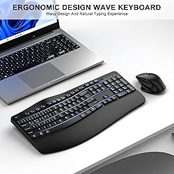 Wireless Keyboard and Mouse Combo, 2.4G Full Size Wave Keys Ergonomic Keyboard with Wrist Rest and 3-Level DPI Adjustable Wireless Ergonomic Mouse for Windows, Mac OS Desktop/Laptop/PC(Black)