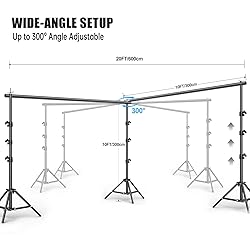 10x20FT VERSATILE SETUP: This 10x20FT background stand offers flexible L-shape and horizontal angle, perfect for creating dynamic shooting angles and multi-scene setups. Ideal for photography, video production, and event backdrops DUAL BACKDROP STAND: This stand support allows you to hang two different colored backdrops simultaneously, enabling quick scene changes and creative versatility 360° ANGLE ROTATION: Rotation Crossbar Connector with angle adjustable mount. Make Background screens adjust at various angles for your needs, extended as many as needed. High flexibility and versatility for professional studio environment HEAVY DUTY LIGHT STAND&CROSSBAR: This heavy duty light stand can be adjusted in height from 3.0ft to 10ft, they are strong and durable & stable pole backdrop stand. 2 Crossbars can be connected by a crossbar connector, the combined maximum width reach 20 ft. Max Load Capacity 40 LB FREE CARRY BAG & CLAMPS: This kit includes 6 spring clamps, and free carry bag, making it easy to use , and convenient to carry and store