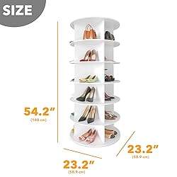 ORGANIZED AND BEAUTIFUL - Make your shoes neat and organized with this rotating shoe rack tower lazy susan; The space saving design can hold up many shoes or bags in a compact space; SIZE: 23.2"W x 23.2"D x 54.2"H 6-TIER WHITE SHOE DISPLAY HOLDER - Keep your home clean and keep track of your shoes better with this spinning shoe rack tower; Makes every shoe visible and save so much of your room closet storage space MORE SHOES IN LESS SPACE - With the spinning design, this shoe rotate organizer can hold a large number of shoes in the small area; The modern design of the shoe cabinet will fit in any home decor STURDY CONSTRUCTION - The shoe rack tower is made of durable solid board; Sturdy enough to hold different shoes; You can also put your handbags, hats or any other accessories on this shoe rack EASY TO ASSEMBLE - It is super easy to put the spinning shoe rack tower together; You can assemble easily with the included instructions; And it won't take up too much of your time