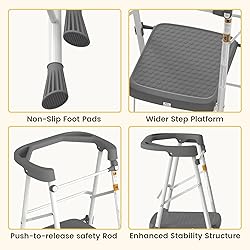 MATERIAL SAFETY: The kid's step stool is made of environmentally friendly materials that are safe and harmless to children, and high-quality aluminum alloy, which ensures your baby's safety while being lightweight and durable, giving you a high level of peace of mind! NON-SLIP AND STABLE: The ladder “A” structure is stable and sturdy, reducing the risk of tipping over. And comes with non-slip feet. The countertop also has non-slip bumps and four rails for support, providing your child with all-around protection. NO ASSEMBLY REQUIRED: This toddler tower requires no assembly and is ready to use when opened. Simple to open and close, press the pedal to open, hear the click to lock, close by pulling up the pedal can be folded COMPACT AND LIGHTWEIGHT: The folded size of the toddler stool is only 39.8*18.5*3.3in, weighing 9.9lbs. you can easily move it from room to room, providing help for your child anytime anywhere PROMOTES INDEPENDENCE: This toddler assistance stool can hold up to 250lbs, suitable for children from 18 months to 4 years old, our foldable toddler tower can provide help on the counter, bathroom sink or anywhere your child needs it, fosters independence and builds confidence as your child grows.