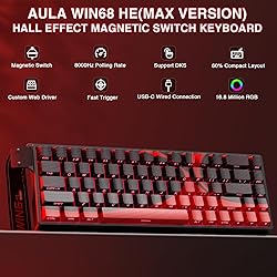 Fast Trigger Gaming Keyboard: AULA WIN68 HE MAX magnetic gaming keyboard offers an industry-leading 8,000Hz polling rate and 8x faster response time than traditional mechanical keyboard. Combined with ultra-low latency (0.2ms), it ensures your commands take effect instantly, giving you an edge in the game. The fast trigger keyboard is perfect for gamers and coders, greatly enhancing the gaming experience and work efficiency. Hall Effect Keyboard with Magnetic Switch: Equipped with advanced hall effect magnetic switches, the WIN68 HE MAX gaming keyboard offers adjustable actuation point(0.01mm-3.3mm), and each key can be personalized to the smallest unit of 0.1 mm, providing an ultra-precise keying experience. In addition, press/reset sensitivity can be individually set via software to match the keystroke habits of different people in different types of games Customizable Web Driver: The mechanical gaming keyboard is equipped with a professional web driver that allows users to customize RT/SOCD/DKS/MT/TGL functions, key mapping, macro editing, RGB lighting and other settings on windows systems without downloading(This driver does not support MAC, only compatible with Windows system). It provides one-stop management of the keyboard, allowing users to truly experience customization and personalization. Web driver connection: bit.ly/m/AULA 16.8 Million RGB Backlit keyboard: The light up keyboard features 16.8 million colors of RGB lighting effects with south-facing LEDs for a better visual experience. 14 preset lighting effects add a great ambience to your games. Lighting effects and brightness can be easily adjusted via driver or FN and key combinations. The backlight can be turned off if not needed 60% Compact Wired Keyboard: Designed for professional gamers, the 60% gaming keyboard saves up to 40% of desktop space while retaining the arrow keys and basic function keys. FN and key combinations unlock all keyboard commands. The 68-key wired gaming keyboard with detachable USB cable provides gamers with a more stable connection and greatly enhances the gaming experience. The small size and lightweight design make it easier to carry and perfect for business trip