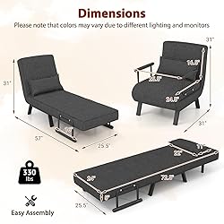 [4-In-1 Convertible Design] The sleeper chair bed easily converts between a floor chair, chaise lounge, and single person bed. Ideal for seamless transitions, this chair adjusts to your daily needs, providing a smart solution for small living spaces or as an extra bed for guests. [6 Positions Adjustable Backrest] The modern sofa features a 6-level adjustable backrest, ranging from 0° to 85°, allowing you to sit, recline, or lie down for activities like gaming, reading, working, or sleeping. When it’s time to rest, easily unfold the backrest to a flat position and extend the leg support for maximum comfort. [Optimal Comfort] Designed with your comfort in mind, the chaise lounge couch is crafted from skin-friendly linen fabric and densely padded with supportive sponge. Included is a removable pillow, enhancing your relaxation experience whether you’re sitting or sleeping. [Metal Construction] Built to support up to 330Ibs, the leisure accent chair bed boasts a robust metal frame, ensuring stability. Moreover, it is equipped with removable armrest covers and protective foot pads to keep your floors scratch-free from everyday use. [Multi-Scene Versatility] Perfectly suited for any room, from apartments to offices, living rooms to bedrooms, the 4-in-1 sleeper chair bed provides a multifunctional seating and sleeping solution. Please note that colors may vary due to different lighting and monitors.