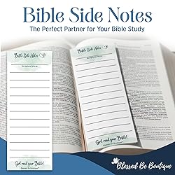 - Bible Side Notes - Premium Scripture Companion for Your Faith Journey. Transform your Bible study experience with Bible Side Notes - the perfect solution for capturing divine inspiration right where it happens! Tired of losing your spiritual insights or running out of space in your Bible margins? Our innovative Bible Side Notes solve this problem forever. Created in collaboration with Post-It Brand, these premium 2 7/8" x 8" adhesive notes are specifically designed to enhance your time in God's Word. Each package contains TWO convenient notepads - one with right-side adhesive and one with left-side adhesive - giving you perfect placement options for any Bible layout. With 50 sheets per pad, you'll have plenty of space to document your spiritual journey. Bible Side Notes attach securely to your Bible's spine, keeping your personal reflections, prayers, sermon notes, and revelations right next to the scripture that inspired them. No more searching for loose papers or watching sticky notes fall out - your insights stay exactly where you need them. Whether you're studying Psalms, diving into Paul's letters, or finding wisdom in Proverbs, Bible Side Notes provide the extra space you need without writing directly in your Bible. Create a personalized study experience that builds over time, creating a beautiful record of your walk with God.