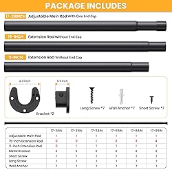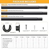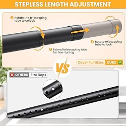 Tool-Free Continuous Adjustment: This upgraded telescoping closet rod features seamless length customization to perfectly fit any space - from compact wardrobes to walk-in closets. No cutting required, zero gap design ensures instant precise sizing for any closet configuration. Note: Only one adjustable main rod has a end cap; the others do not Heavy-Duty Construction: 1.3" diameter heavy duty closet rod withstands up to 66 lbs without bending. Adjustable closet rod features rust-resistant coating and textured matte finish that prevents clothing slippage while resisting scratches and corrosion Sturdy U-Shaped Brackets: 1.9"x2.3"x0.9" industrial-grade metal brackets outperform plastic alternatives. Integrated locking screw secures rod position, eliminating slippage while allowing quick disassembly Quick & Easy Installation: Adjustable Closet rods for hanging clothes complete hardware kit includes dual-length screws (wood/tile/cement compatible). Simple 3-step setup: Mount brackets → Connect closet poles → Tighten security screws. Suitable for indoor/outdoor use on various surfaces including drywall, wallpaper, and concrete Multi-Functional Space Solution: Beyond closet organization, this adjustable closet rod also can be used as laundry room drying rod, room divider, curtain rail, shower curtain rod, RV storage bar, or window security lock. Matte black finish blends seamlessly with modern and traditional décors alike