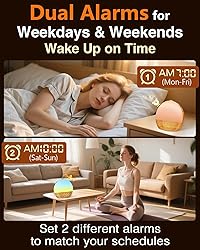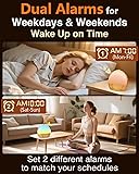 SIMULATES NATURAL SUNRISE WITH GRADUAL LIGHT - Wake up naturally with a gradual sunrise simulation. Sunrise light gradually brightens from 1% to 100% over your chosen 10-60 minute period before alarm, helping you rise refreshed and energized. Say goodbye to harsh wake-ups and enjoy a serene start to your day DUAL ALARMS FOR FLEXIBLE SCHEDULING - Set two independent alarms to suit different schedules. Perfect for couples, roommates, or heavy sleepers who need an extra wake-up call. Whether it’s a second chance to rise or different wake times, this feature ensures no one misses their alarm SLEEPING SOUNDS: 30 SOOTHING SOUNDS - Help you fall asleep naturally with 30 soothing sounds including white, pink, brown noise, rain, wind, and ocean waves. These calming frequencies help quiet the mind, promoting faster sleep onset and deeper rest. Ideal for light sleepers, kids, adults, and office use, creating a serene environment for restful sleep BLUETOOTH CONNECTIVITY FOR CUSTOMIZED SOUND & VERSATILE- Stream your favorite music, podcasts, or meditation sounds via Bluetooth for a personalized wake-up experience. Easily connect your smartphone or tablet to start the day with your preferred sounds, creating an ideal morning ritual.Includes both USB-C cable and universal adapter for versatile power compatibility across home, travel, and mobile setups ADJUSTABLE LED DISPLAY WITH 9 NIGHTLIGHT COLORS - With a full-range display dimmer, customize the brightness of your LED display to match your preference. Choose from 9 different nightlight colors with 20 adjustable brightness for soothing, eye-friendly lighting that helps kids and adults relax before sleep SLEEP TIMER FOR A RELAXING NIGHT'S REST - Set a sleep timer to gradually dim sounds and lights, allowing you to fall asleep effortlessly. With options ranging from 10 to 480 minutes, this timer ensures your environment stays peaceful without disturbing your sleep SNOOZE FUNCTION FOR EXTRA REST - Need a few more minutes of sleep? With the intuitive snooze function, you can extend your rest with a single tap. Perfect for those who need a short nap before fully waking up, ideal for heavy sleepers or morning struggles SMART HUB BUTTON FOR EASY CONTROL - Control your alarm clock with one-touch convenience. Use the Smart Hub Button to toggle white noise modes, one-click snooze, set alarms, adjust volume, or activate sleep timers—all without the need for apps or complicated settings STYLISH WOOD DESIGN FOR HOME DECOR - This alarm clock features a sleek, modern wood design that blends seamlessly with any room’s décor. Ideal for bedrooms, offices, or kids' rooms, its functional and stylish appearance makes it a perfect gift for family, friends, or loved ones IDEAL FOR ALL AGES AND SLEEP TYPES - Perfect for teenagers, adults, and seniors, this alarm clock adapts to any sleep style. It’s especially helpful for individuals dealing with insomnia, sleep disorders, or anyone seeking to create a peaceful and calming sleep environment