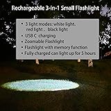 3 LIGHTING MODES: Featuring white light mode, red light mode and black light model for optimal illumination in any situation.Perfect for nighttime observers, the red light flashlight allows you to watch turtles, snakes and other reptiles without disturbing them. Red light flashlight can also be used for astronomical observation. Zoomable Small Flashlight: The high lumens of the small flashlight has Zoomable function, it can be used as a spotlight or floodlight, you can easily stretch the LED flashlight head to adjust it, the spotlight is used for long-distance observation, and the floodlight is used for large-area illumination MULTI-PURPOSE FLASHLIGHT with Memory Function: Rechargeable compact flashlight with memory function is very easy to use when the light is on for 5 seconds.. This small LED flashlight is perfect for a variety of outdoor activities such as camping, hiking, running, jogging, fishing. PORTABLE SIZE: The mini pocket flashlight is lightweight and compact enough to fit conveniently in a pocket, car glove box, toolbox, nightstand or purse, making it ideal for EDC gear 395 NM Blacklight Flashlight: 395 NM blacklight can be used for pet dog urine, resin curing and stain detection USB-C RECHARGEABLE FLASHLIGHT: The small LED flashlight contains a high-capacity rechargeable battery, suitable for indoor and outdoor use for a long period of time, and can be quickly recharged with just a Type-C cable. It can light up for at least 5 hours on a full charge RUGGED CONSTRUCTION: Rugged compact handheld flashlight is made of aluminum alloy for excellent rigidity and durability