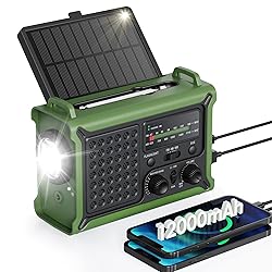 【Enhanced Solar Performance】Equipped with a large 8500mm² monocrystalline panel, this emergency radio captures more sunlight and converts it into usable power faster than standard models. A reliable backup power source for blackouts, outdoor use, and emergency situations. 【Fast & Efficient Hand Crank Generator】Crank just 1 minute to power emergency calls, lighting, or news updates—2× faster than standard models. With a reinforced crank arm and high-efficiency internal dynamo, it's designed for real-world emergencies. 【Real 12000mAh Emergency Power Supply】Unlike radios with exaggerated claims, this weather radio built-in real 12000mAh battery delivers dependable power whenever you need—charging your phone, running lights, and keeping you connected during blackouts, storms, and disasters. No guesswork—just real, tested capacity you can trust. 【Dual Emergency Lights】Features a powerful 5W adjustable-beam flashlight and a soft 12-LED reading lamp. Both offer multiple brightness levels for reliable lighting in blackouts, camping, or nighttime use. 【Home & Outdoor Essential】This IPX6 waterproof weather radio keeps you powered, informed, and heard—with 5 ways to charge, NOAA alerts, and a loud SOS alarm. Compact, durable, and reliable—perfect for both emergency preparedness and outdoor adventures. 【NOAA Alerts & Hurricane-Season Ready】This NOAA weather radio ensures your family receive reliable alerts directly from the National Weather Service and triggers a 9-second alarm to give you preparation time before disaster strikes. During hurricane season, it provides emergency lighting and backup power to charge your phone—helping you stay safe, connected, and ready.