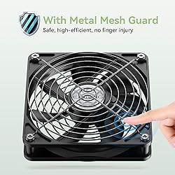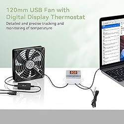 【120mm USB Fan with Digital Temperature Controller】This USB cooling fan features a digital display thermostat that precisely tracks and monitors temperature. Temperature control range: -50 to 110°C; Control accuracy: ±0.1°C; Input voltage: DC 220V; Output power: 1500W. 【3 Adjustable Wind Speeds】The computer fan USB features a 3-speed controller (low, medium and high) to control the wind speed. Air Volume: 50/53/56 CFM; Rotating Speed: 1000/1250/1500 RPM. Depending on the operating environment, you can choose between different wind speed levels. 【Long Lifespan】This 120mm electronics USB cooling fan adopts hydraulic bearings for extreme durability and long lifespan. The light and compact size is perfect for narrow place, and its square design allows the fan to be laid flat or stand upright. 【Metal Grill Protector】Metal grill on both sides to prevent the blade from hurting your fingers and damaging the wire when working. The corner joint is equipped with cable protection glue, which is wear-resistant, not easy to break, and is safer and more reliable to use. 【5V USB Powered】Size: 12 x 12 x 2.5 cm. The USB desk fan is perfect for cooling PC/laptop/TV box/receiver/AV cabinet/PS5/PS4/projector/router. You can use it in any place with USB power supply.