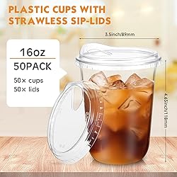 Ample to Use and Share: you will get 50 pieces of 16 oz plastic cups with sip lids; The rich quantity can provide you more alternatives Due to the manufacturing process, the actual capacity of the product may be smaller. If you mind, please purchase with caution Strawless Sip Lid: our disposable cups with strawless sip lids can minimize spills and leaks; The no straw design allows you to quickly drink coffee anytime, anywhere, etc Round Bottom Design: our round bottom plastic cups with lids adopt a round bottom design, and the bottom of our cup is made of thickened material to prevent the cup from tipping over, making it more comfortable to hold; The overall rounded design is very elegant and beautiful for holding coffee or drinks Crystal and Transparent: our clear plastic cups with lids are made of PET material, which is different from other thin plastic disposable cups; The crystal transparent material allows you to see coffee, milkshakes, smoothies and any favorite drinks at a glance Wide Range of Uses: our cups with lids are suitable for holding coffee, juice, smoothies, milk tea, etc. They are also good replacements for coffee shops, and can also be applied as purchases for beverage shops, restaurants and other occasions