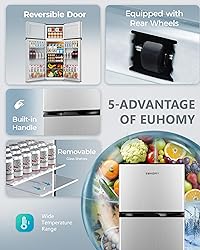 THE COMBINATION OF FRIDGE-FREEZER - Euhomy refrigerator combines the advantages of fridge and freezer to design the apartment size refrigerator with freezer 2 door. 1.8 Cu.Ft of freezer zone can be used to store ice cream or frozen food. 5.6 Cu.Ft of fridge zone can be used to preserve fresh fruits, vegetables or refrigerated drinks. 7-LEVEL TEMPERATURE ADJUSTMENT - Refrigerator with freezer adopts advanced 3D refrigeration technology and supports 7 temperature settings. Fridge is also equipped with a powerful compressor, and it does not cause too much noise while operating efficiently, so you will enjoy a quiet atmosphere. EVERYTHING IS SIMPLE AND EASY - Euhomy designed LED lights inside fridge. Even if you turn on apartment refrigerator at night, you can still see the inside of the refrigerator very clearly. The multi-layer shelves and crisper drawer of the apartment fridge completely help you solve the problem of food odor. The shelves are adjustable. Everything is to help you have more options. FLEXIBLE CONFIGURATION- The design of the reversible door makes your apartment fridge suitable for a variety of positions in the room, giving you more options in the direction of opening the door. The adjustable feet allow dorm refrigerator to be placed horizontally on the ground. Garage fridge is equipped with rear wheels, which can be easily moved to the desired location ACCESSORIES & SERVICES - EUHOMY professional team to provide you immediate service, ready to respond to your needs. Product packing list: 2 door refrigerator *1 Glass shelf *3 Shelf Divider*1 Fruit&Vegetable box*1 Ice shovel*1 Ice tray*1 User manual*1. Please note: You'd better put the fridge upright for at least 1 day before using it