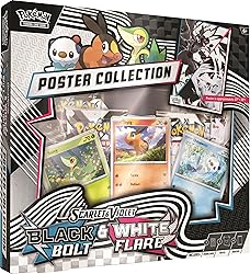 The Pokémon TCG: Unova Poster Collection includes 3 foil promo cards featuring Snivy, Tepig, and Oshawott. This also includes 2 Pokémon TCG: Scarlet & Violet—Black Bolt booster packs and 2 Pokémon TCG: Scarlet & Violet—White Flare booster packs. This also comes with 1 double-sided poster, 26.875" × 39" and a code card for Pokémon TCG Live.