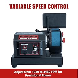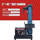 Built for Metalwork:Powered by a 3.5A DC motor, this metal belt sander delivers consistent torque for metal grinding, polishing, and knife sharpening — a reliable knife sharpening machine for metalworking professionals and enthusiasts Variable Speed Control Panel:The variable speed belt sander is equipped with a control panel,offers a wide adjustable belt speed range from 1240 to 4480 FPM and lets you easily adjust belt speed for different materials and operations — from knife sharpening to fine metal polishing, making it ideal for metalworking and knife making projects Quick Belt Release & Tracking Handle:Features a quick-release belt tension handle for fast, tool-free belt changes, saving time during material transitions. The tracking knob ensures the bench top sander runs smoothly and accurately for precise sanding and knife sharpening Adjustable Leveling Foot:Comes with an adjustable foot to stabilize the belt sander on uneven surfaces. The sturdy metal base with rubber feet reduces vibration and keeps sanding stable — perfect for workshops and DIY users seeking precision and control Multi-Position Installation for Flexible Use:This belt sander supports three installation modes — vertical, horizontal, and wall-mounted — allowing users to choose the best setup for their workspace. It’s a space-saving design ideal for compact workshops, garages, and DIY areas