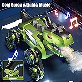 【Roaring T-Rex Design & Terrain Fun】Made of high-strength ABS and sturdy bionic joints, it’s built to last. The 8WD system with shock-proof, anti - slip tires lets it zoom over gravel in the driveway, crawl through backyard grass, tackle sandy beach trips, or even climb small stairs. Switch between road and off - road modes easily, turn the living room into a stunt track or the garden into a dinosaur adventure land! 【Amazing Stunt Show】This dinosaur monster truck not only moved, but also performed. Do 360° spins forward/backward on the kitchen floor, drift left/right around toys in the playroom, climb "mountains" of pillows, or pull off standing wheel tricks that'll amaze friends at a birthday party. With double-sided 4WD, even if it flips, the fun never stops, perfect for non -stop action during sleepovers or weekend play! 【Control Is A Breeze With Two 2.4G Options】Innovative gesture sensing for interactive play or the multi-function remote for precise commands. Watch as it does 360° rotation forward/backward, right/left steering, right/left drift, climbs rocks, incredible 360° rotation and awesome standing wheel skill, double-sided 4WD ensures non-stop action. 【Lights, Music & Spray】Add water to the tank, and watch the dino "breathe" spray from its mouth, plus, it lights up and plays cool music! It's like a mini-rave during evening play, a hit at birthday parties, or a fun way to end a school day. Transform ordinary play into an immersive, sensory-filled adventure that kids will beg to repeat. 【Ultimate Gift For 6 7 8-12 13 14 Year Old Boy Birthday Gifts】With a roaring T-rex design, 8WD off-road power, and showstopping stunts, it's a must-have for dinosaur lovers and car fans alike. Packaged in an exquisite gift box, it's the perfect present for boys ages 6-14, ideal for birthdays, holidays, back-to-school, Christmas, etc.